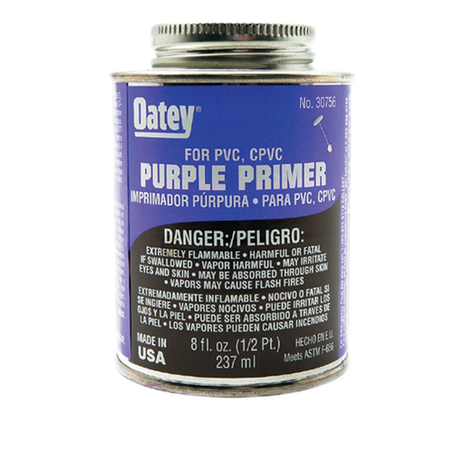 Oatey® 530-30756 Purple Primer is an NSF-listed, aggressive primer for use on all schedules and classes of PVC and CPVC pipe and fittings. It removes contaminants such as surface dirt, grease and grime as well as softens the pipe surface to allow for a fast, secure solvent weld. This primer's purple tint provides visible verification that a primer has been used, which is ideal for areas where plumbing code require this proof. It also applies easily with included in-lid dauber.