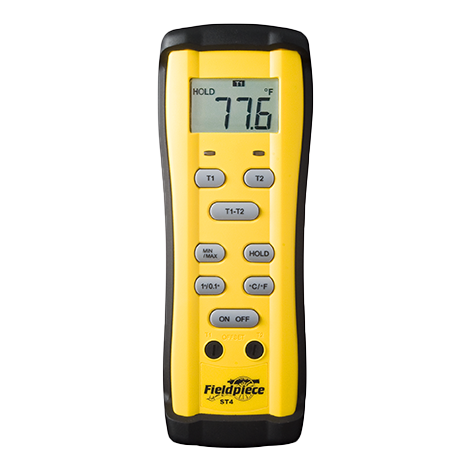The Dual-Temperature Meter, model ST4, measures two temperatures simultaneously using the included k-type, wrap tab beaded thermocouples. Its technology provides superior temperature compensation in rapidly changing environments common in field service. Use the ST4 to find Delta T and measure various temperature splits, displaying T1, T2, and T1-T2 on the large LCD screen. It features two front-face calibration pots and includes a clear front case with a magnetic hanger.Designed specifically for HVAC/R, this meter calculates the temperature difference in English or metric units, offering the benefits of a digital thermometer in a heavy-duty design. Due to its internal technology, the ST4 stabilizes rapidly even when moved between different environments like rooftops and walk-ins, providing faster and more accurate readings compared to meters using thermocouple adapters susceptible to ambient heat transfer. The included rubber boot and hanging bag facilitate easy, hands-free testing.