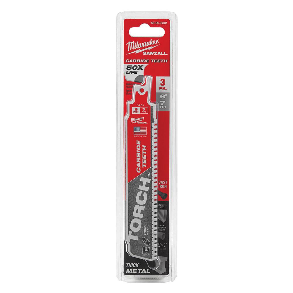 Milwaukee® The Torch™ Reciprocating Saw Blade, 6 in Length, 1 in Width, 0.05 in Thickness, Carbide Blade, Teeth per Inch: 7 TPI, 1/2 in Shank, Universal Shank